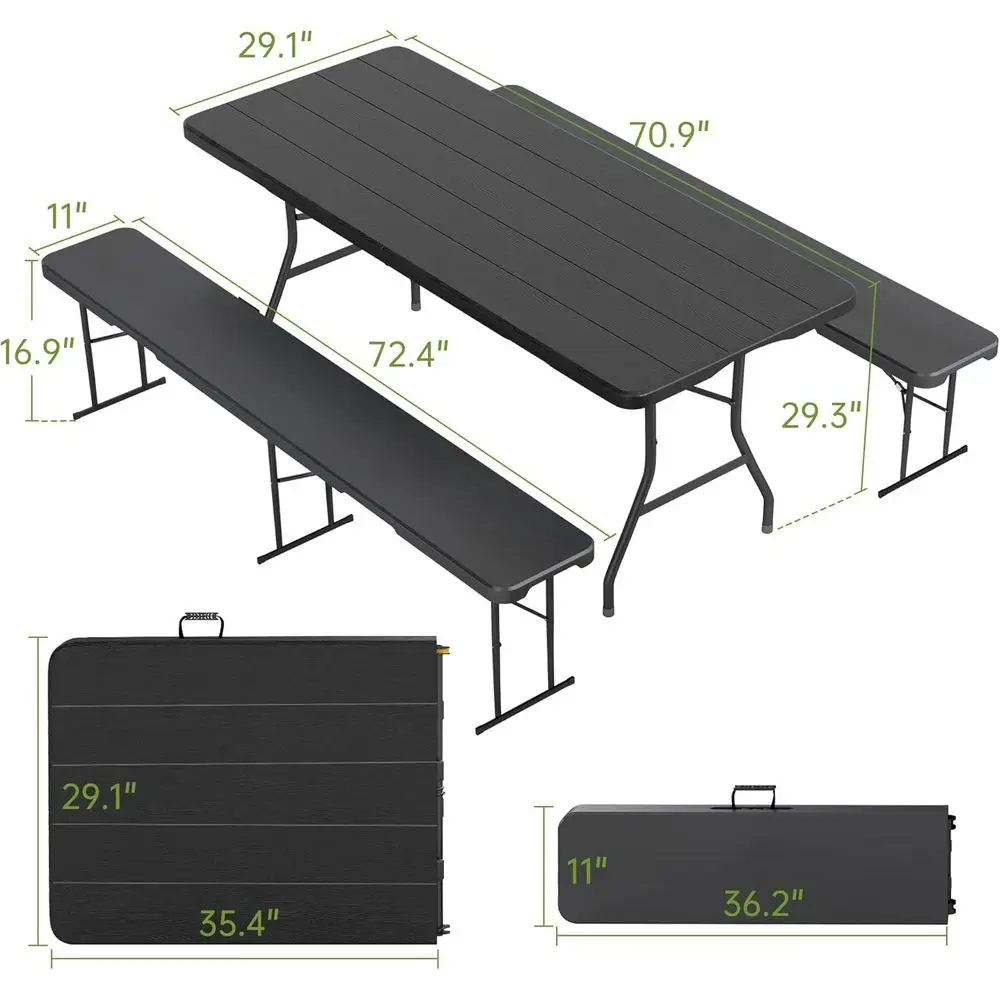 6' Picnic Table with 2 Benches, 3 Piece Black Wood Grain Portable HDPE Folding Camping Table and Benches for Courtyard, Garden,
