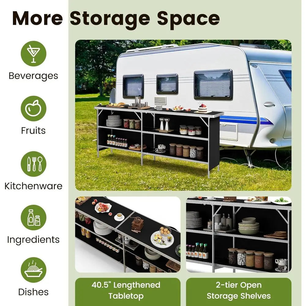 【81” Tabletop & 2 Shelves】The 81” long top is a perfect prep station for foods, vegetables, snacks. Moreover, 2 lower open shelves facilitate classified storage for plenty of items like beverages, tableware, baskets. The hoop & loop fasteners included can keep the waterproof cloth attached to the table, keeping items clean and preventing from falling off.