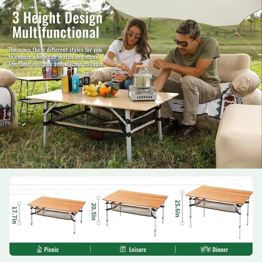 Adjustable Height Folding Table, 4-Fold Bamboo Camping Outdoor Portable RV Camp Table with Carry Bag & Storage for Outdoor Car B