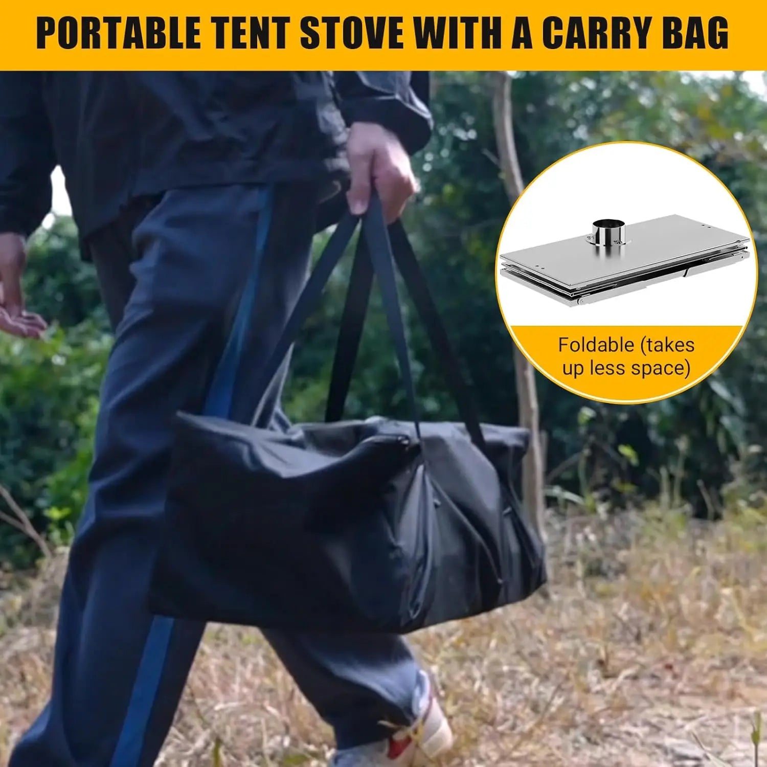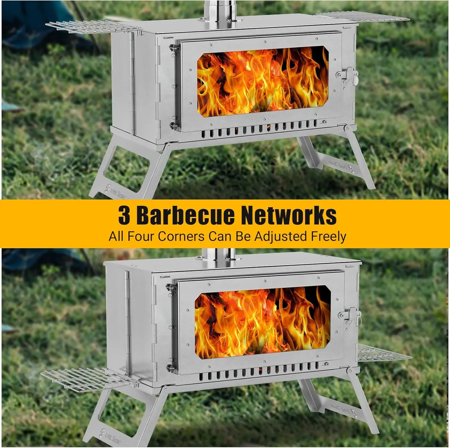 Enhanced Safety & Weather Protection: Features a chimney that prevents rain/snow entry and blocks insects while containing sparks. This hot tent stove maintains optimal airflow in all conditions. The secure cooking grill and anti-tip legs make this Wood Burning Stove perfect for safe .