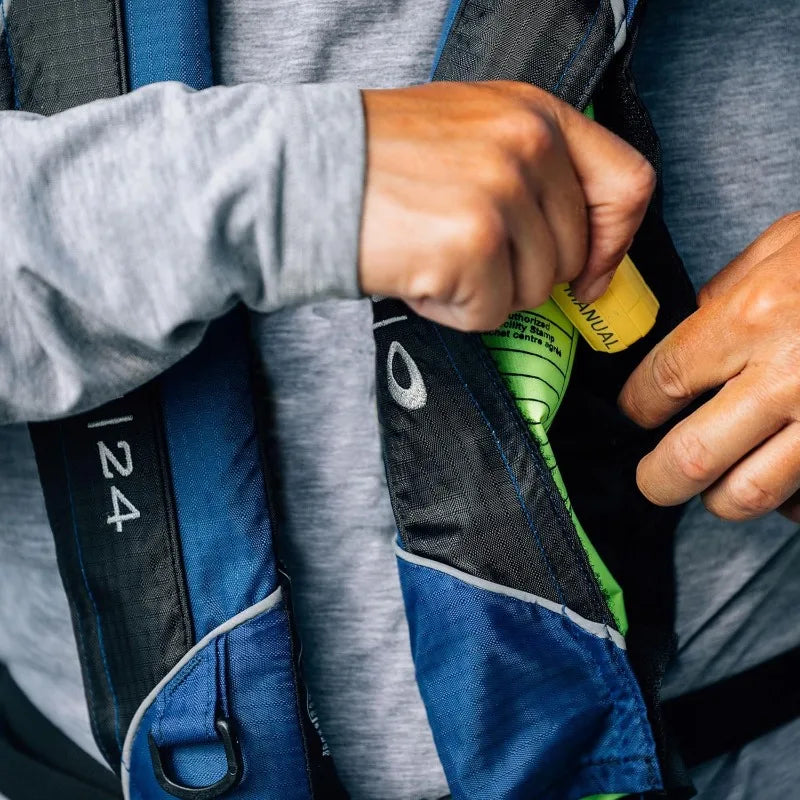 The A/M-24 Auto/Manual inflatable life jacket is lightweight and low profile, and the perfect option for kayak fishing, fishing, paddling, or boating in warmer weather conditions. So lightweight and comfortable you won't know you have it on, until you may need it. This Automatic/Manual life jacket is that it inflates automatically upon immersion in water, but that it also can be converted to MANUAL ONLY inflation.
