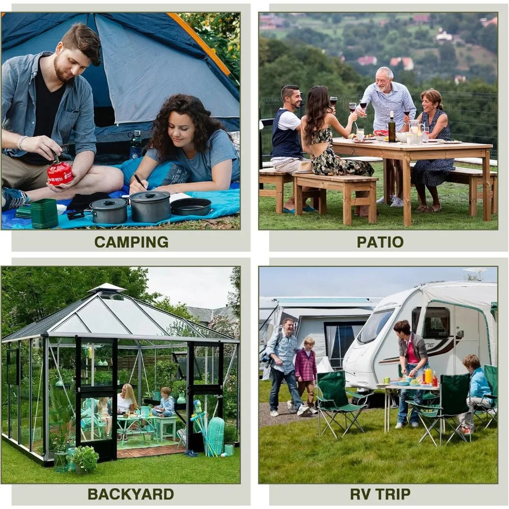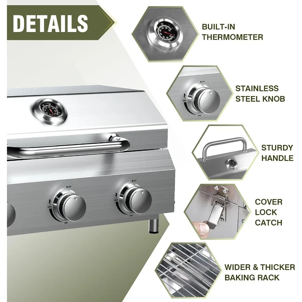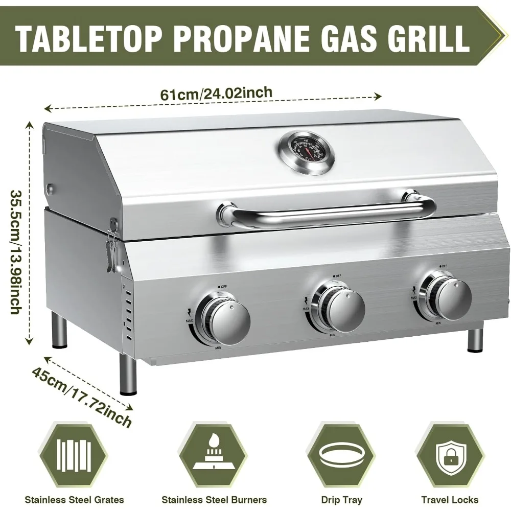 This product features a powerful 30,000 BTU grill with three independent burners, providing rapid searing and even heat distribution across the 24-inch thickened stainless steel cooking grate. The upgraded grate offers superior heat retention, resistance to warping, and strong support for heavy food items, making it ideal for multi-zone cooking and feeding large groups. It also reduces flare-ups and speeds up cooking times, whether you're grilling burgers or brisket. The grill boasts a premium control system with upgraded stainless steel knobs for smooth and durable adjustments to the burners. The high lid creates an oven-like convection zone, perfect for slow-roasting ribs or a whole chicken. An integrated thermometer monitors the internal temperature, and push-button ignition ensures reliable starts. You can independently control each burner from low simmer to high sear, making it easy to master every type of protein. Designed for portability, the compact dimensions of 24"L x 17.7"W x 13.9"H fit RV tables and tailgate setups. Detachable legs allow for ultra-flat storage and transport, and the all-stainless steel construction withstands outdoor elements. The locking lid and reinforced handle secure the components, and assembly takes only 10 seconds with a tool-free design, making it ready for adventures at beaches or on patios. Built to last, the grill has thickened stainless steel grates and knobs that resist corrosion and high heat. A removable grease tray collects drippings to prevent flare-ups, and food residue wipes off the non-porous surfaces with ease. The grill maintains its performance through years of backyard BBQs, rainy camping trips, and coastal cookouts without rusting or warping. The complete grill package includes a 3-burner grill (30K BTU), a heavy-duty thickened cooking grate, three stainless steel control knobs, push-ignition, a removable grease tray, a lid thermometer, a carry handle, four detachable legs, and a propane hose. It's ready to use in 60 seconds when connected to a standard 20-lb tank (not included), with no extra tools required.
