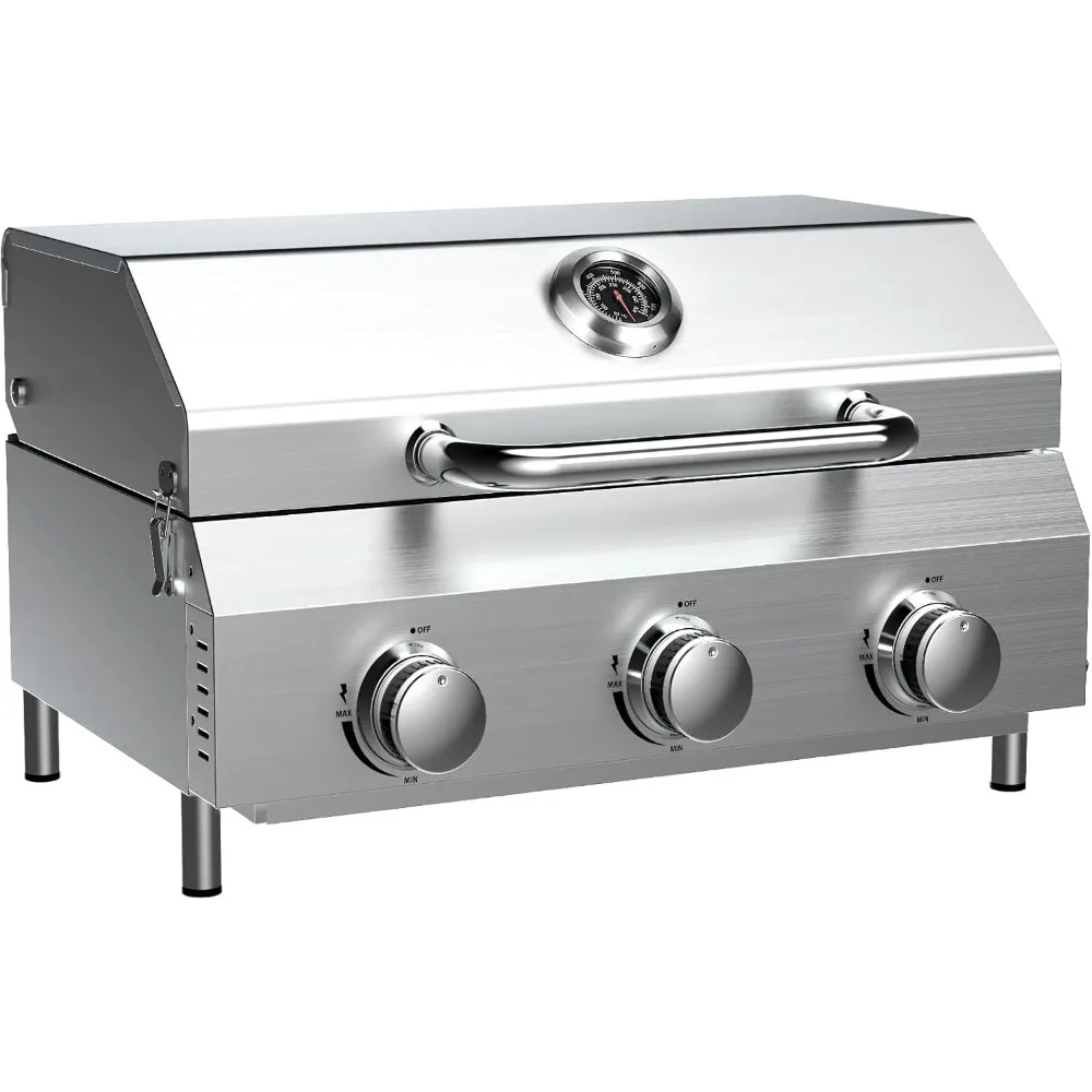 Portable Propane Gas Grill with 3 Burners, 30,000 BTU, Durable Thick Grates and Stainless Steel Controls