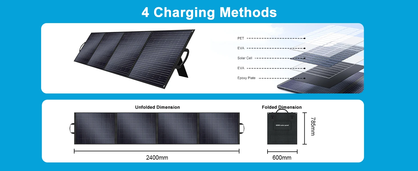 The SolarPlay 400W solar panel features four foldable panels. The unfolded size is (785*2400*30mm), and the lightweight design of 12.5kg makes it easy to carry when moving. The product is suitable for a wide range of applications, including camping, hiking, disaster prevention, and more.